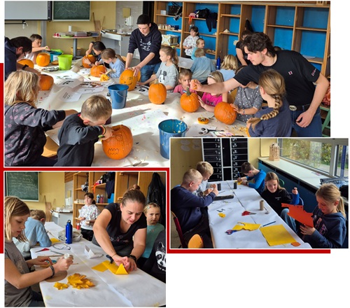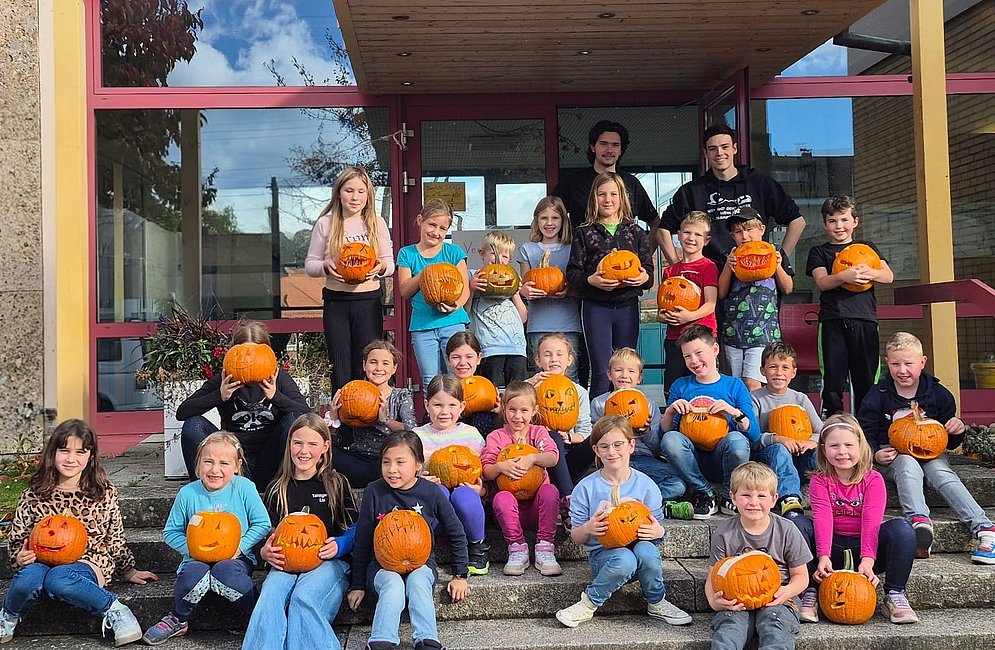 Der Höhepunkt des Tages war aber das traditionelle Kürbisschnitzen. Aus einfachen Kürbissen wurden fantasievolle Gesichter, lustige Grimassen und kunstvolle Muster geschnitzt. Stolz präsentierten die Kinder ihre Werke – ein beeindruckendes, orangefarbenes Meer aus fröhlichen Fratzen.