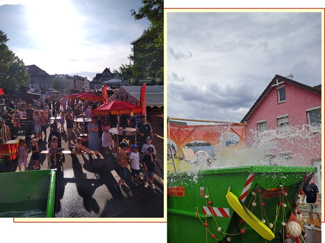 Seit dem ersten Straßenfest ist die DLRG mit dem Container-Spiel am Start und es war wie immer ein Riesenspaß. Seit einigen Jahren bieten wir zusätzlich noch selbstgemachte Burger und Pommes, sowie leckere Cocktails an. Die 200kg Kartoffeln, welche wir zu Pommes verarbeitet haben, kommen von Fridolin Eßt der, wenn nicht gerade Straßenfest ist, samstags seinen Gemüsestand auf dem Marktplatz hat.